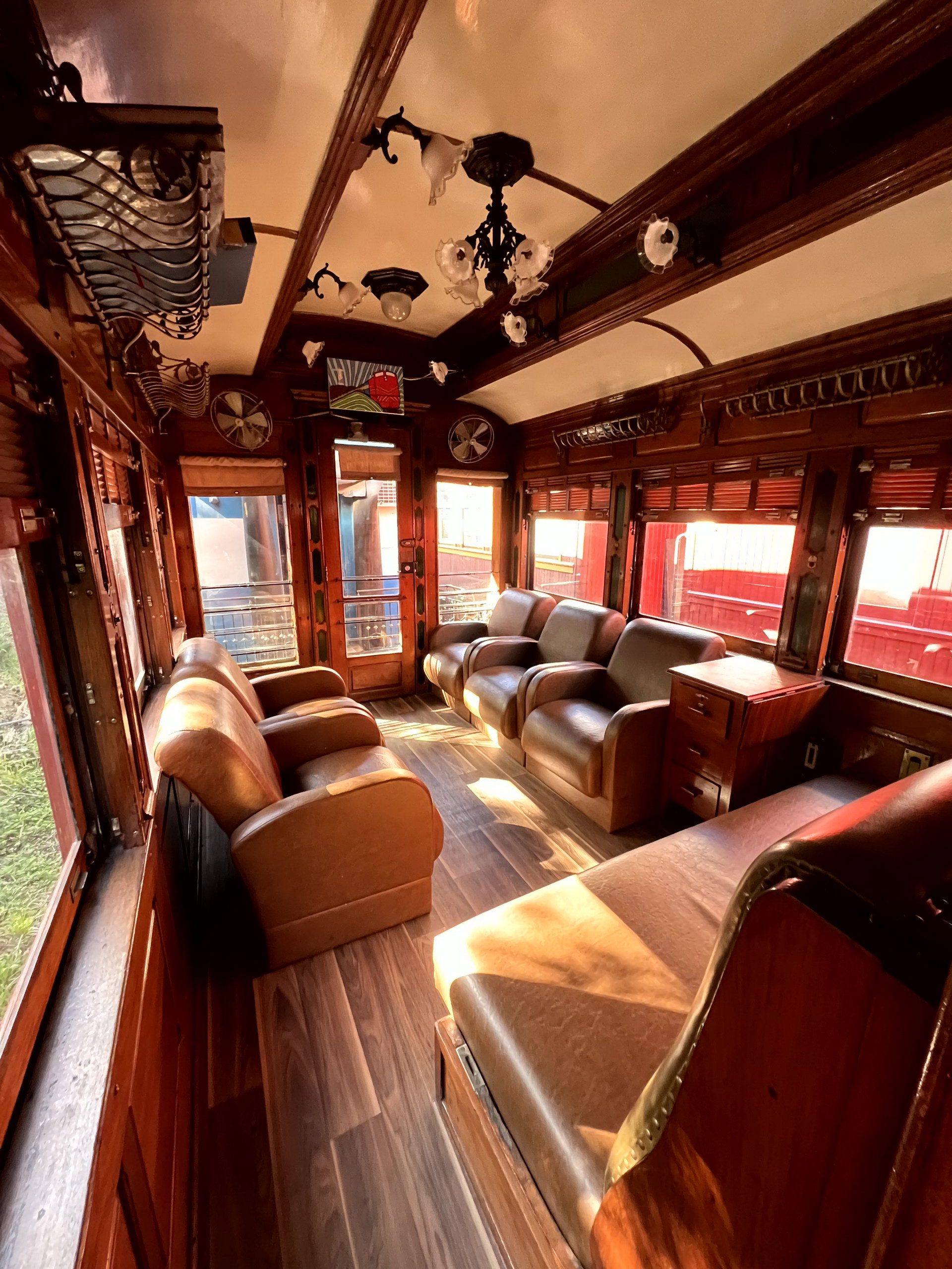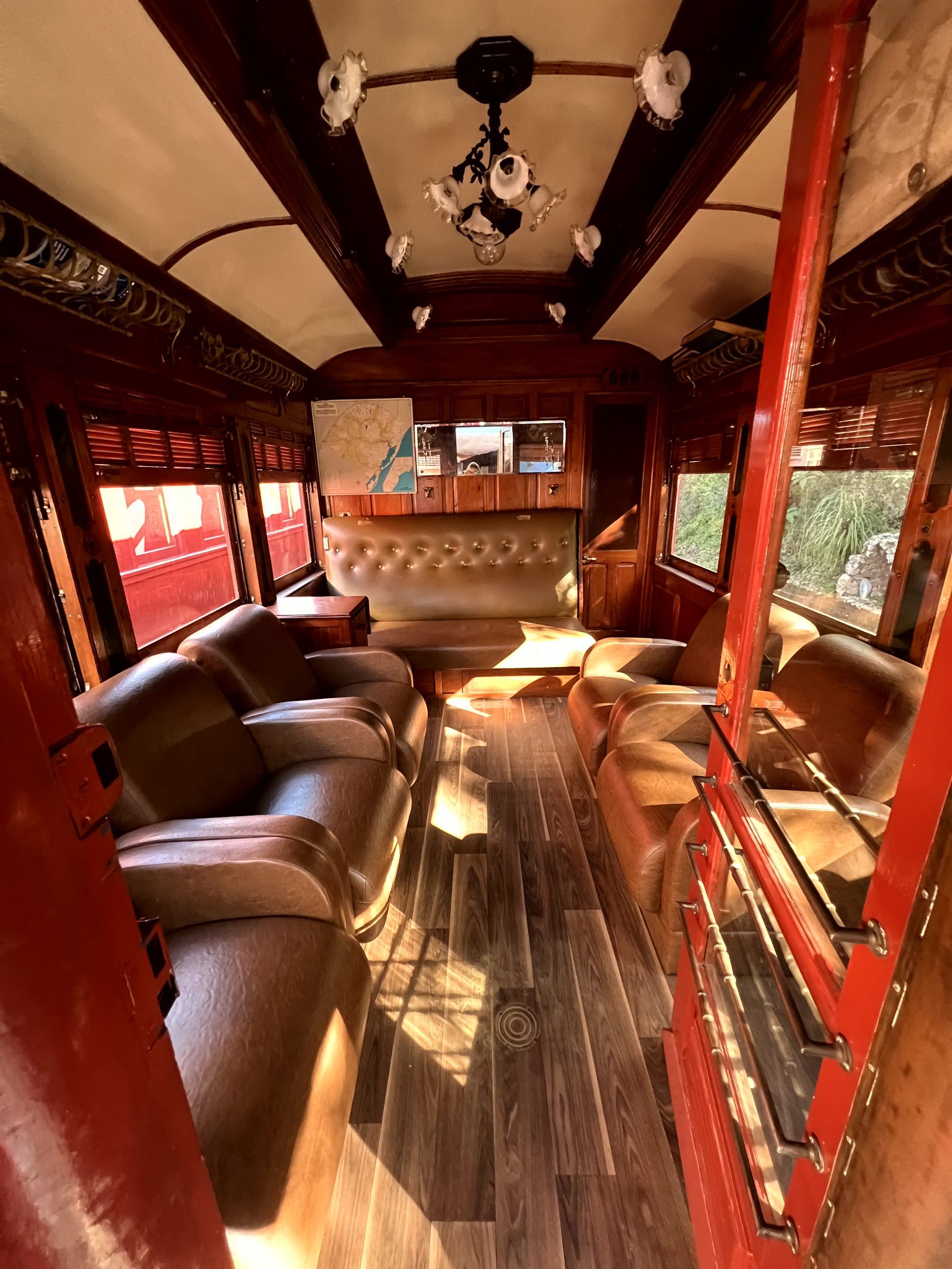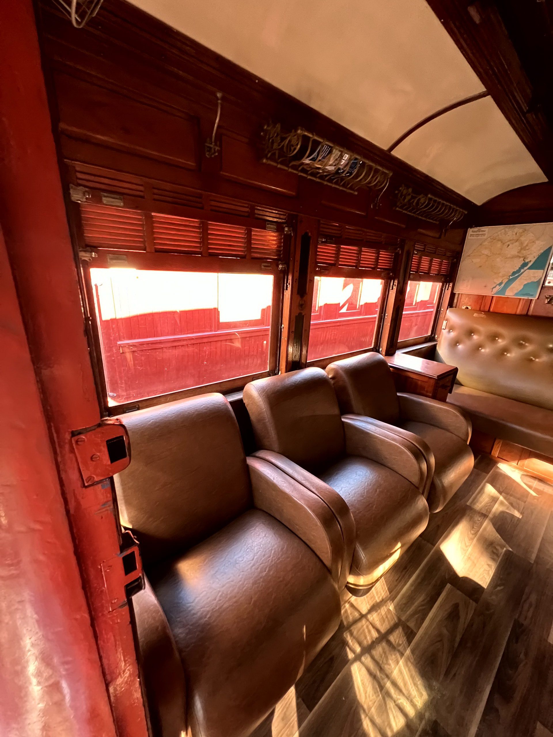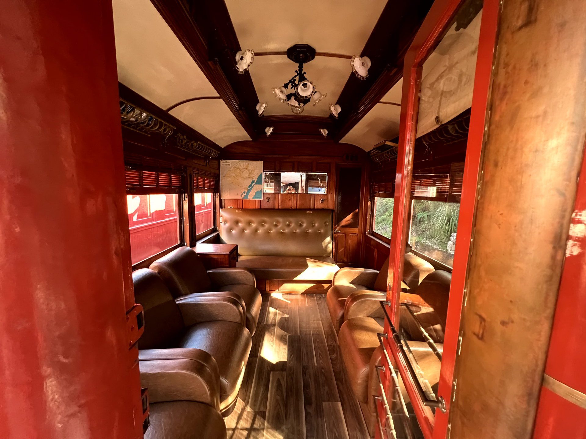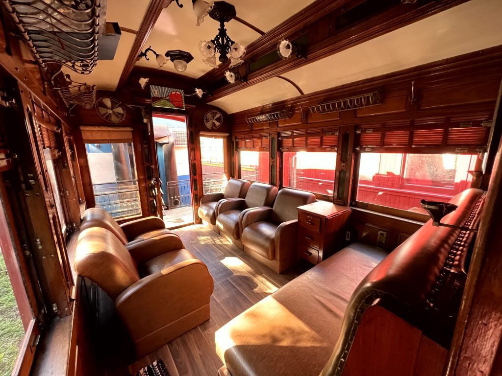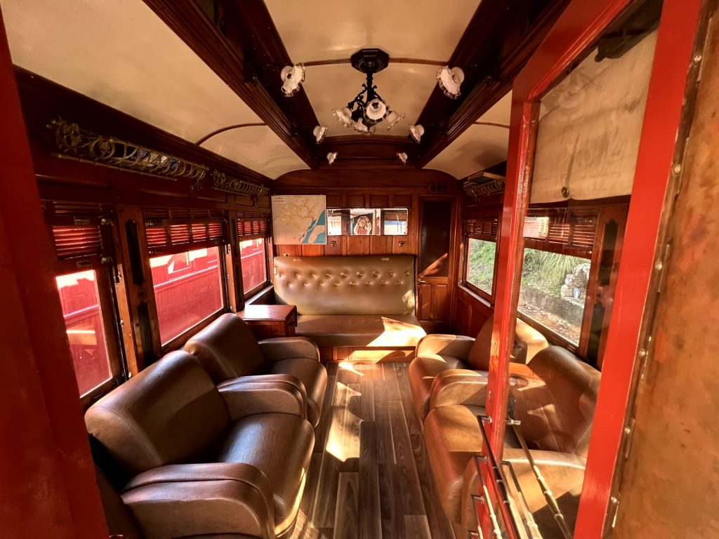 A reforma minuciosa realizada em 2002 preservou suas características autênticas, garantindo que você se transporte para uma época passada enquanto desfruta de conforto moderno. As amplas janelas oferecem vistas panorâmicas deslumbrantes, enquanto os ventiladores e os bancos estofados evocam a elegância da era. Um banheiro exclusivo, com lavatório e espelho, está à disposição dos passageiros.