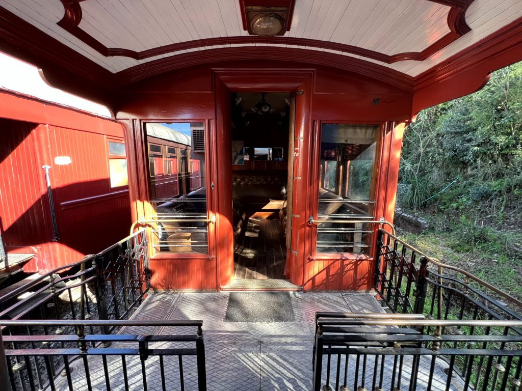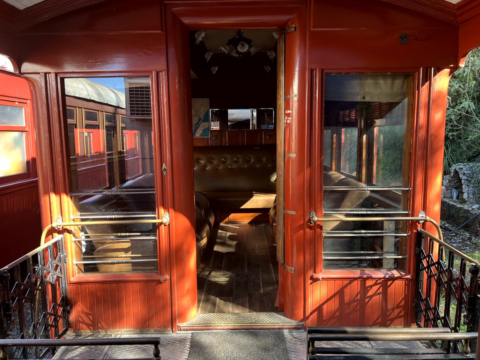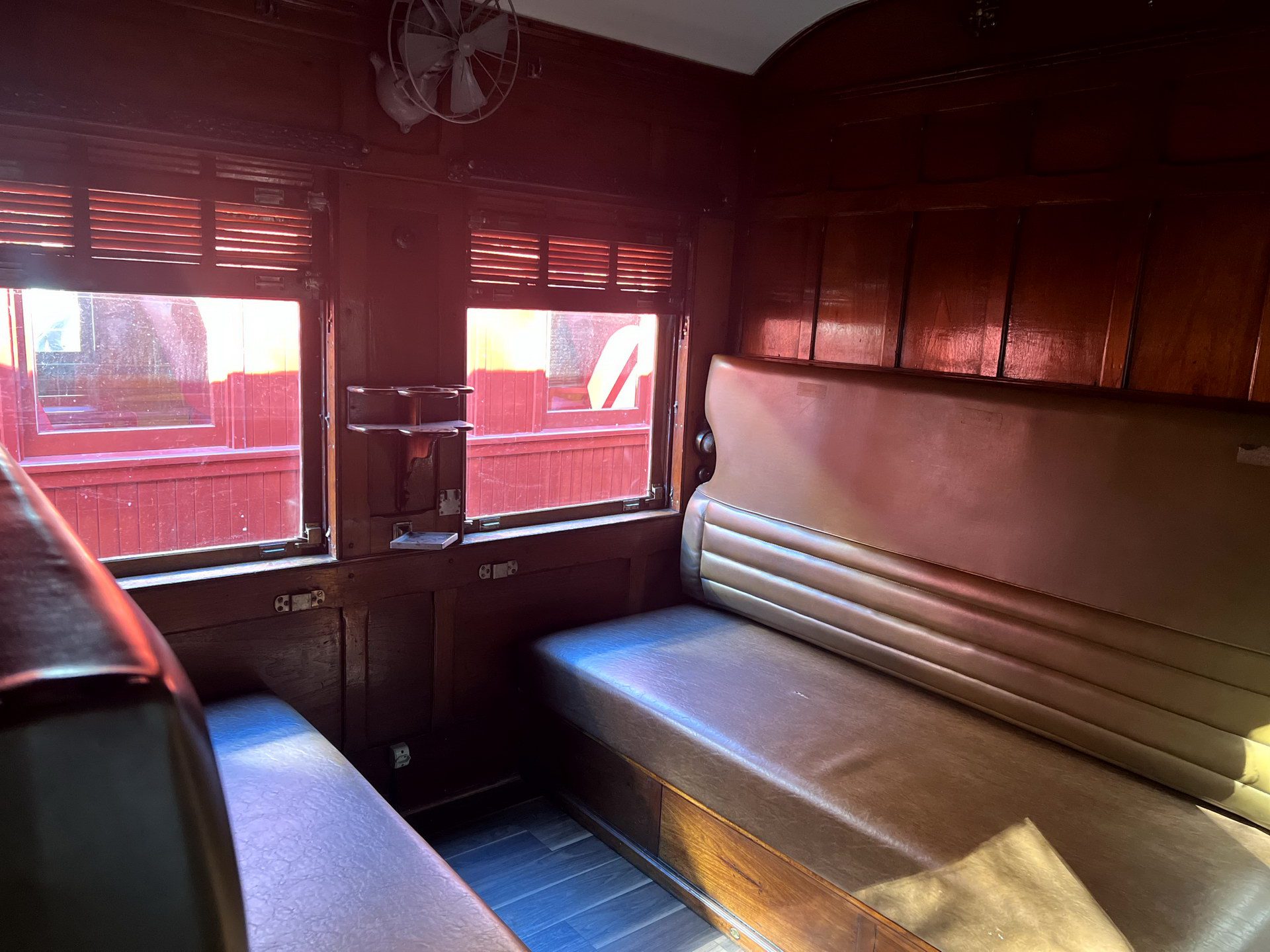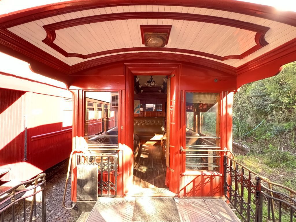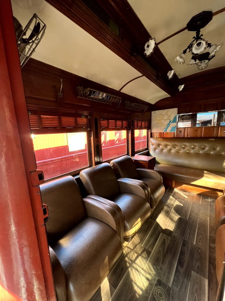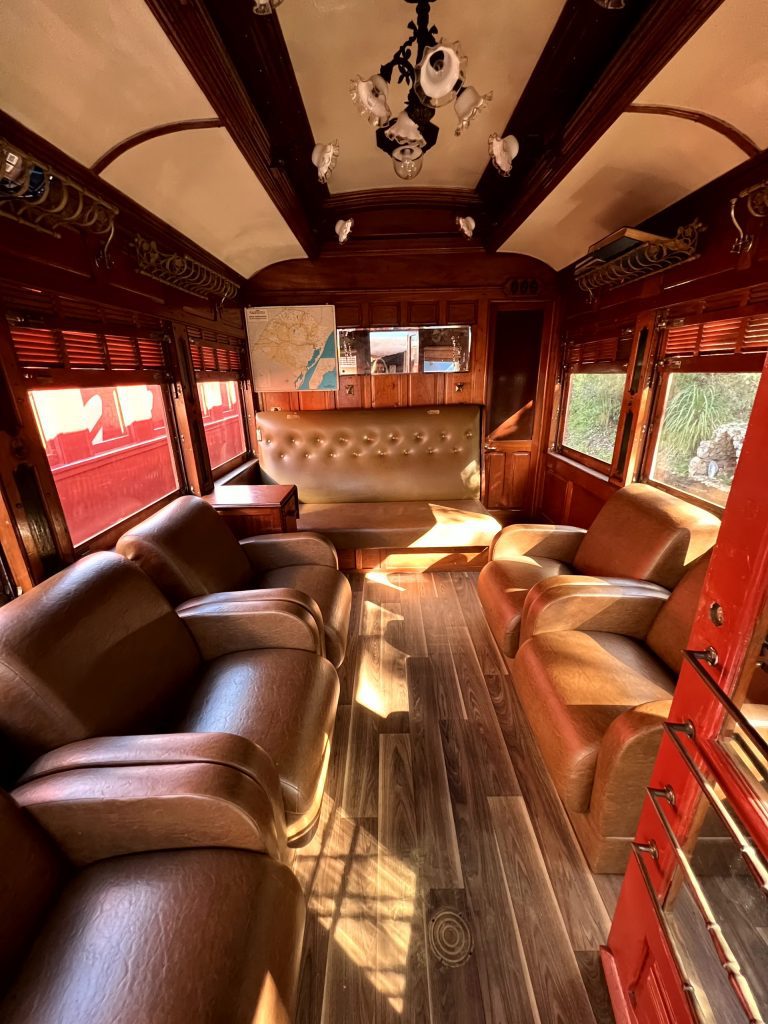 A reforma minuciosa realizada em 2002 preservou suas características autênticas, garantindo que você se transporte para uma época passada enquanto desfruta de conforto moderno. As amplas janelas oferecem vistas panorâmicas deslumbrantes, enquanto os ventiladores e os bancos estofados evocam a elegância da era. Um banheiro exclusivo, com lavatório e espelho, está à disposição dos passageiros.