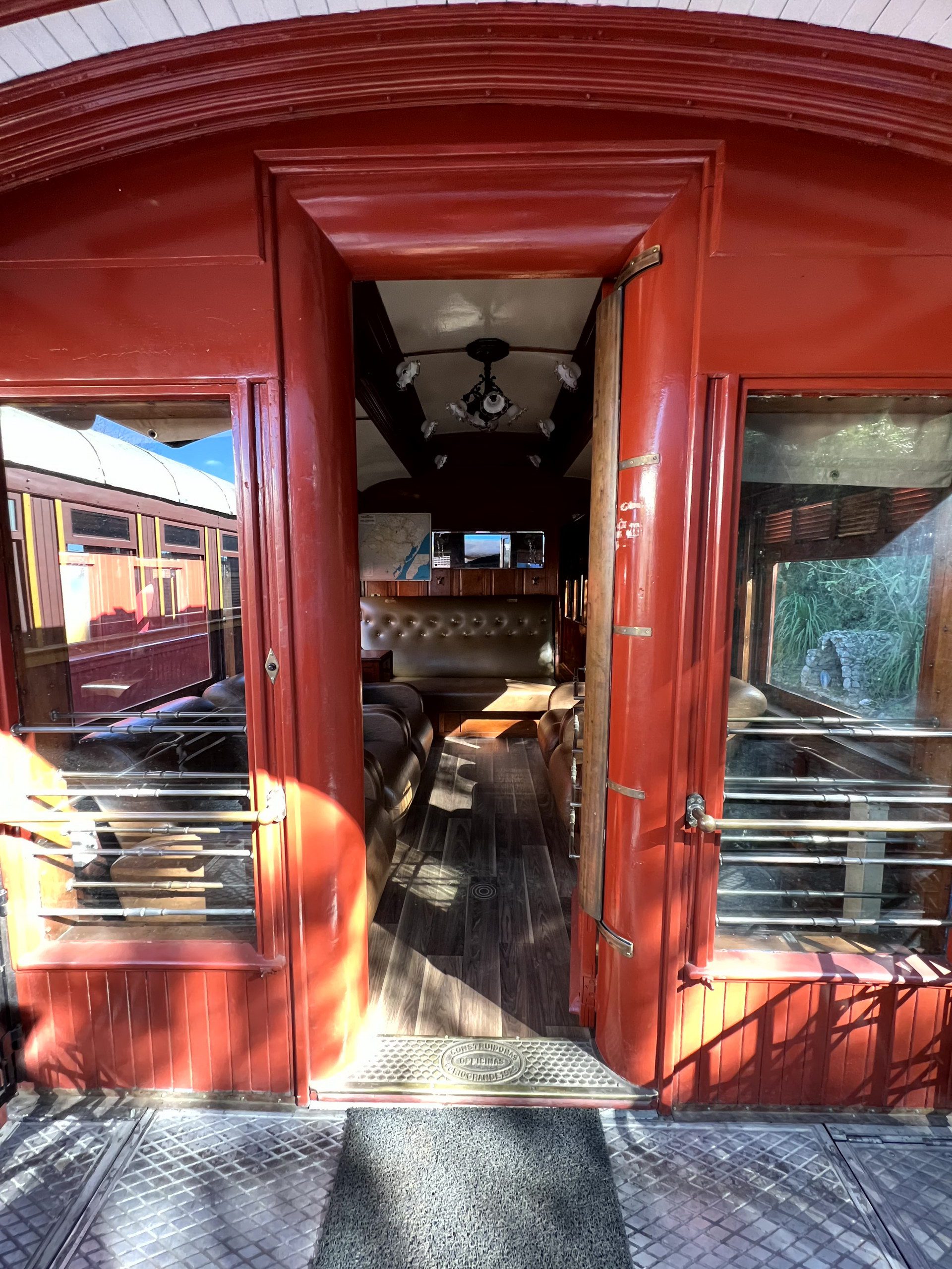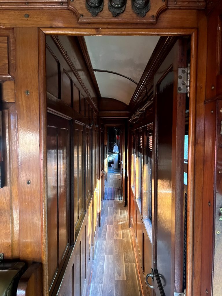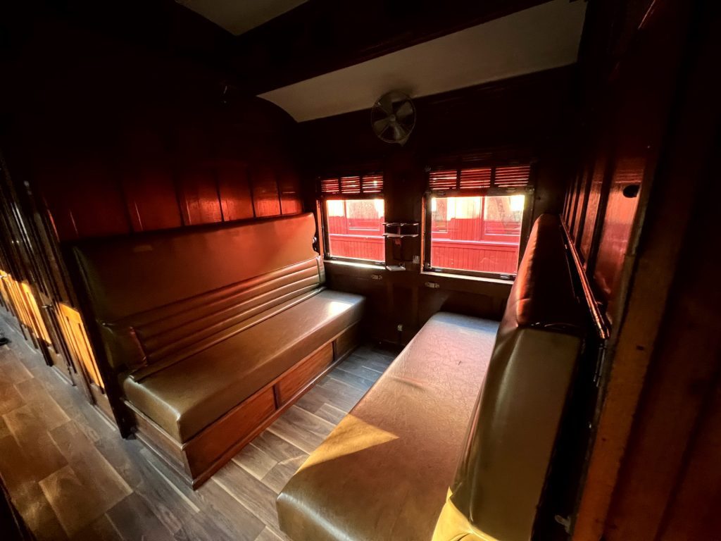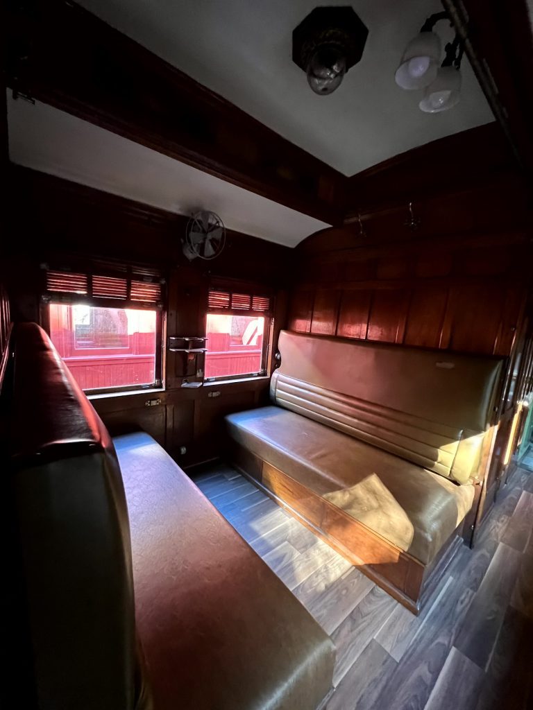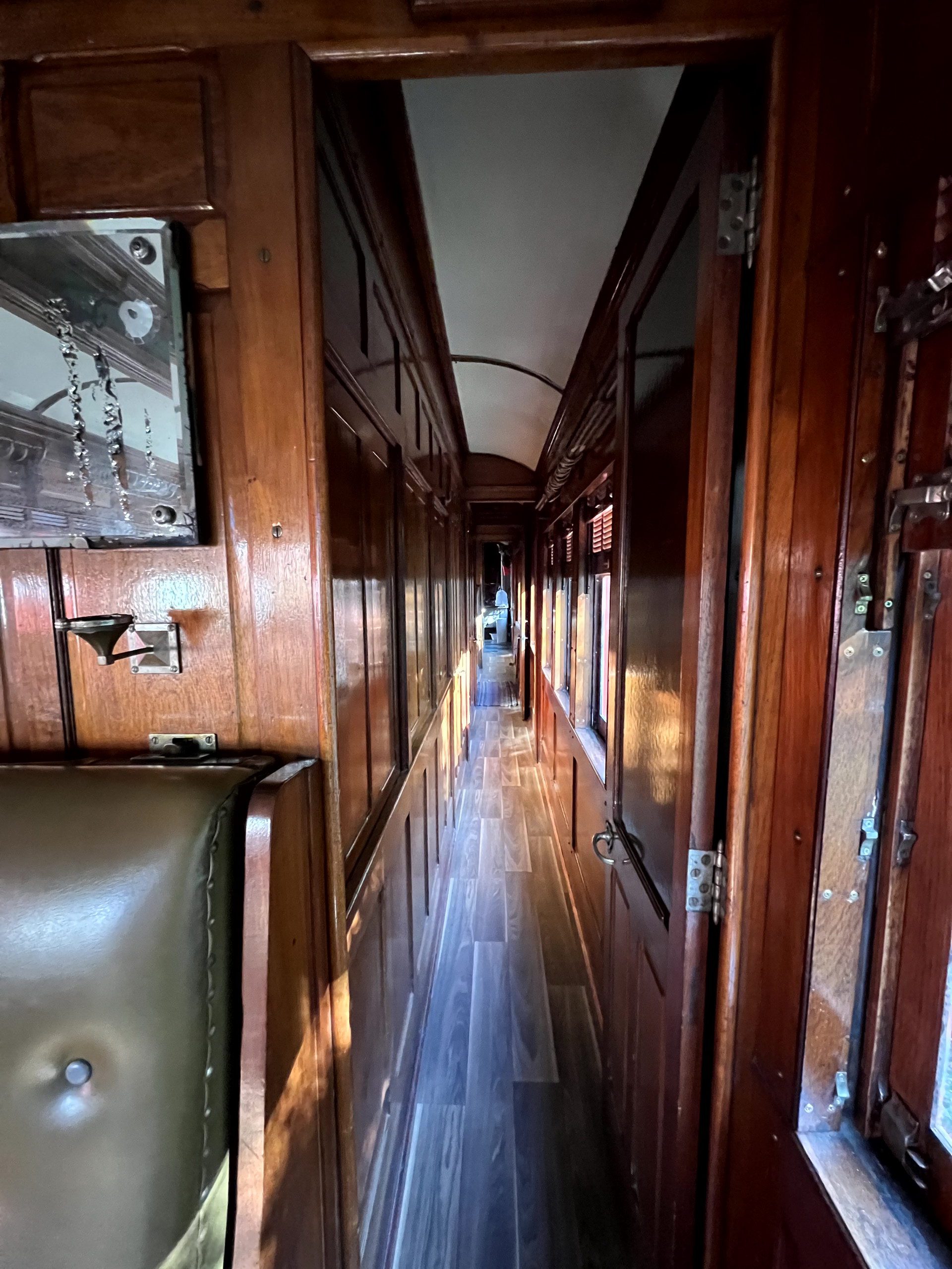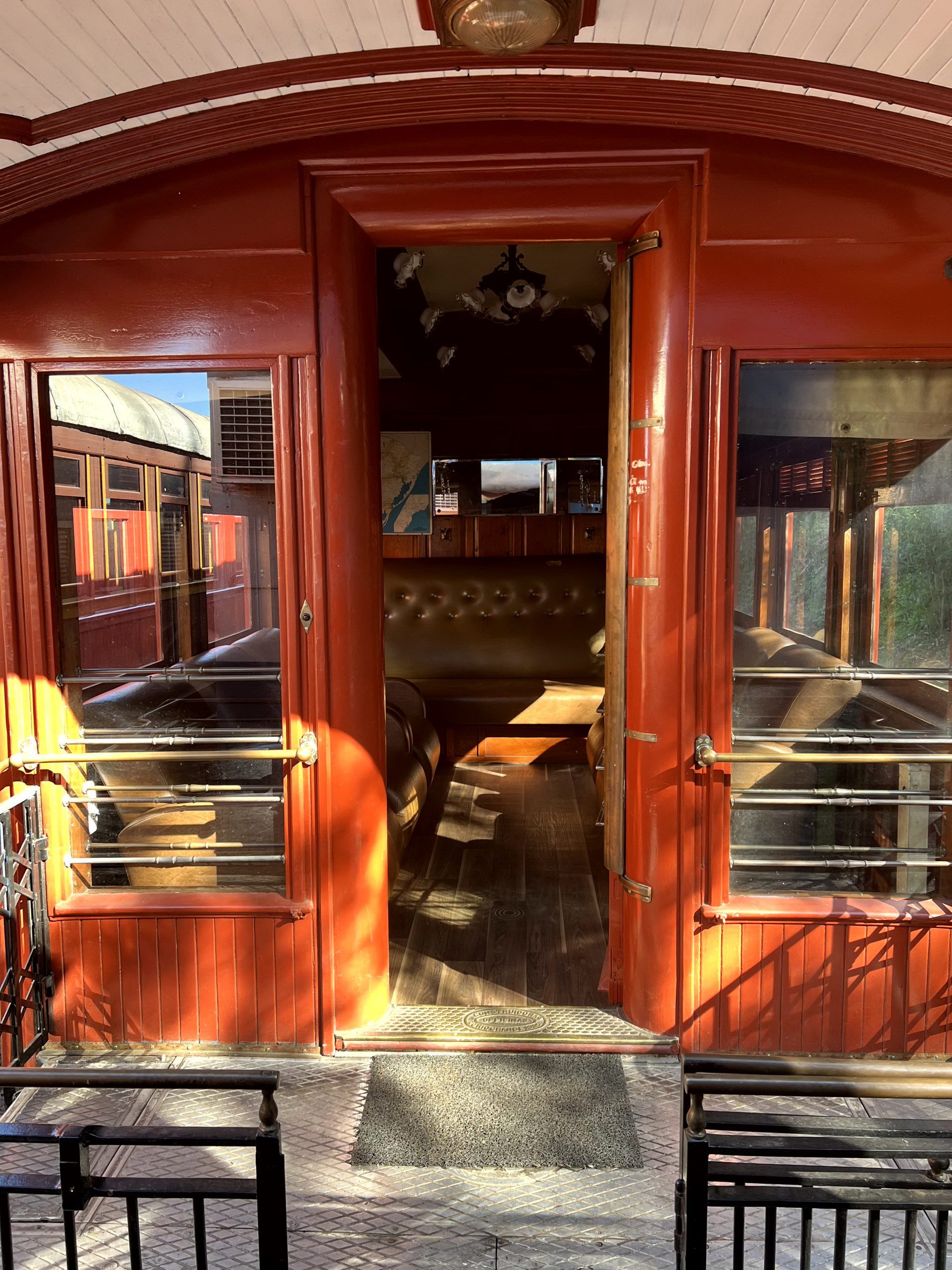 A reforma minuciosa realizada em 2002 preservou suas características autênticas, garantindo que você se transporte para uma época passada enquanto desfruta de conforto moderno. As amplas janelas oferecem vistas panorâmicas deslumbrantes, enquanto os ventiladores e os bancos estofados evocam a elegância da era. Um banheiro exclusivo, com lavatório e espelho, está à disposição dos passageiros.